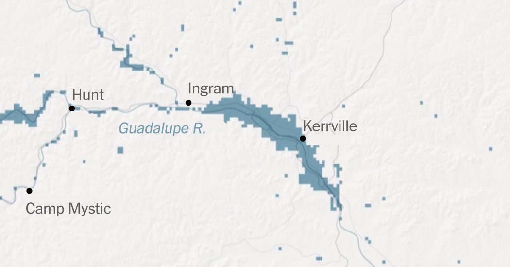 By 1 a.m. Friday, the Weather Service said a very dangerous flash flood event was unfolding in Kerr County, and rainfall rates were reaching up to three to four inches an hour with no indication of easing. The Guadalupe River rose 20 feet in three hours, according to data from a river gauge near Hunt. By 10 a.m., it swelled in the town of Comfort, surging to 34 feet from three feet in about 90 minutes.
