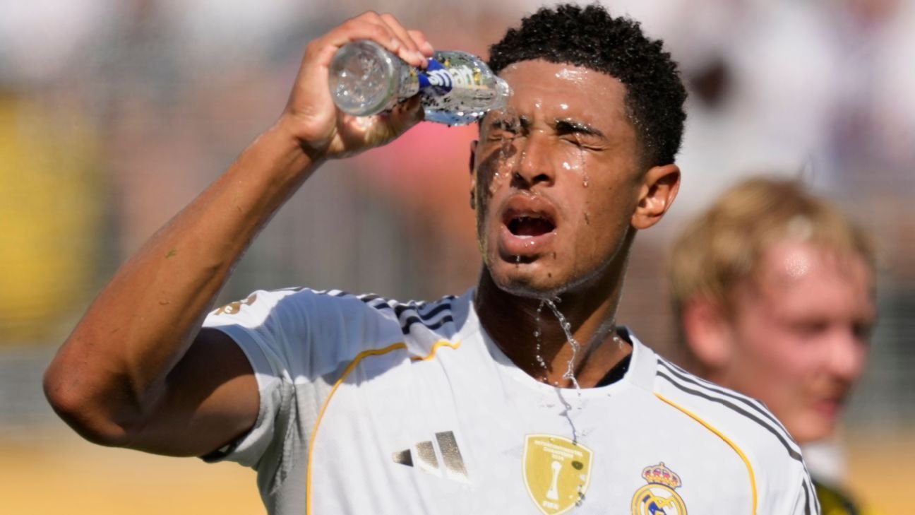 FIFA has allowed one cooling break per half at the Club World Cup, but teams from all over the globe — including Real Madrid and England star Jude Bellingham — have found the conditions extremely difficult. Jose Breton/Pics Action/NurPhoto via Getty Images