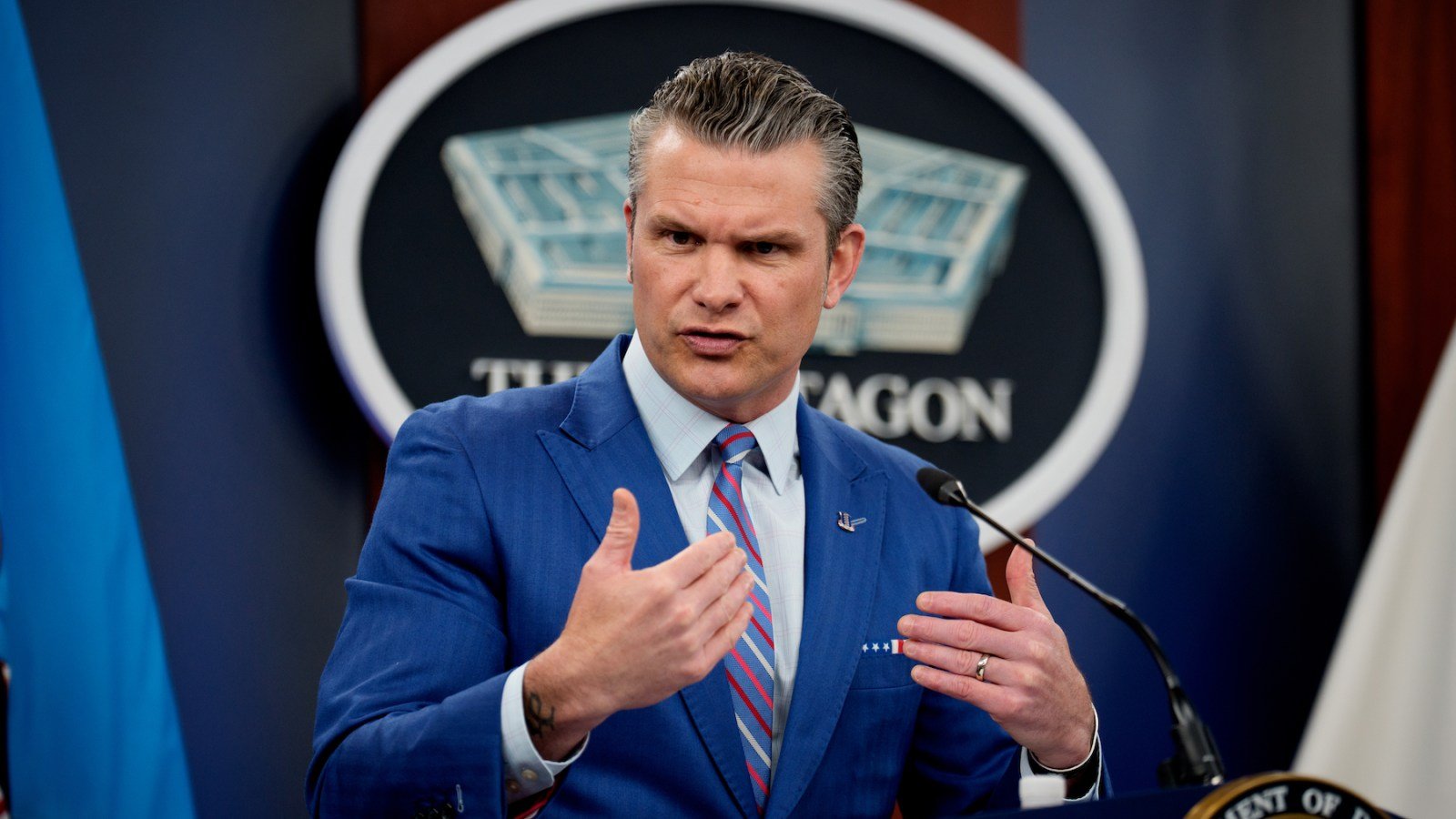 As he speaks, a quadcopter holding what appears to be a blank piece of paper is hovering above Hegseth’s head. He reaches up and grabs the paper. “Here’s the memo we’re signing today, delivered via drone,” he says, signing the page.