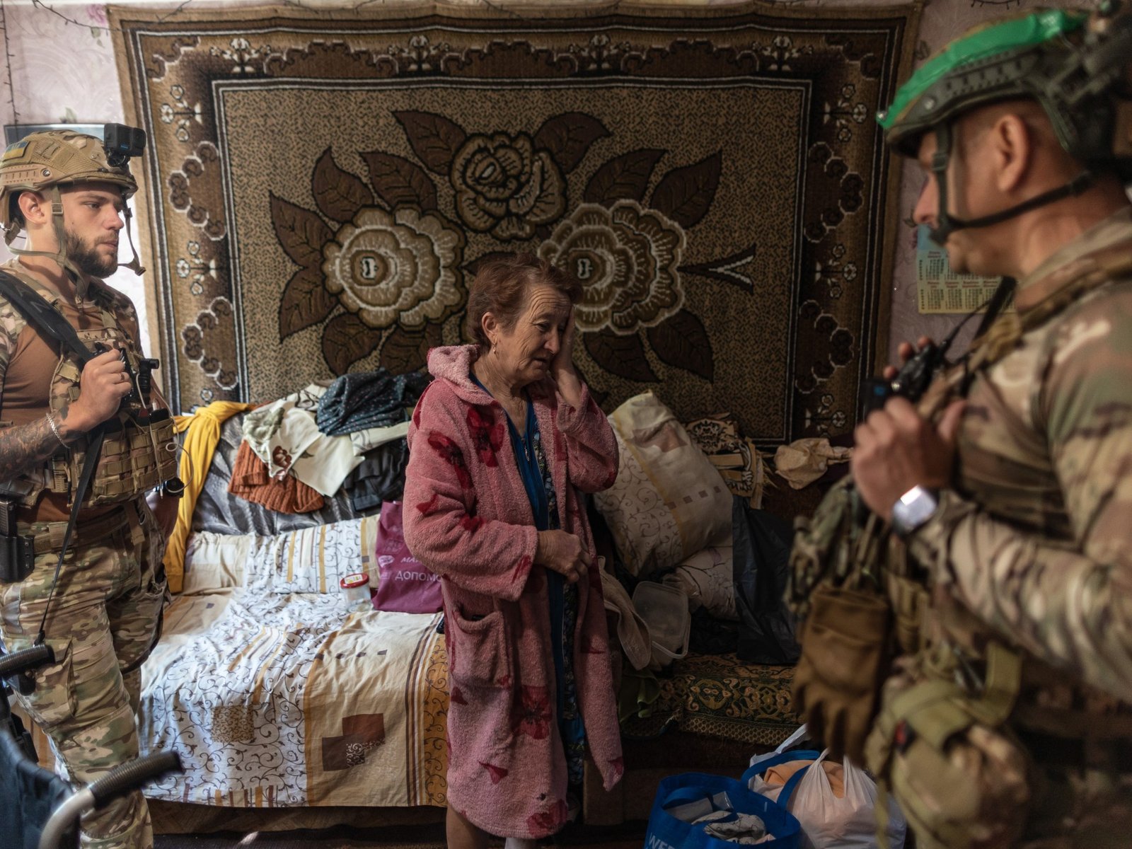 Ukraine’s ‘White Angels’ police group evacuates an elderly woman from the village of Bilytske, following the advance of Russian troops, in the Donetsk region, Ukraine, on August 13, 2025 [Diego Herrera Carcedo/Anadolu]