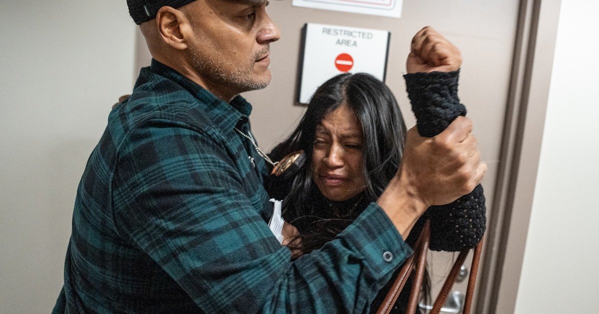 The federal agent yells and waves his finger at Moreta-Galarza after throwing her to the ground.