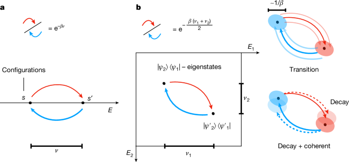 The aforementioned Davies generator was originally derived in the weak-coupling limit λ → 0 (relative to all other energy scales). In this limit, the rotating-wave approximation (or the secular approximation) removes the cross terms \({A}_{{\nu }_{1}}[\cdot ]{A}_{{\nu }_{2}}^{\dagger }\); this perfect isolation of Bohr frequencies causes the Davies generator to satisfy detailed balance, but at the same time, makes it implausible for many-body systems with exponentially small level spacings. To focus on issues related to detailed balance, here we studied only the simplest form of the Davies generator. In principle, different jumps Aa may have different transition weights, as they correspond to the Fourier transform of the bath correlation function \(\langle {{\rm{e}}}^{{\rm{i}}{H}_{B}t}{B}^{a}{{\rm{e}}}^{-{\rm{i}}{H}_{B}t}{B}^{a}\rangle \), but for algorithmic purposes, it is natural to use universal transition weights. Also, we have studied only the dissipative part of the Davies generator (equation (5)). However, the full Davies generator also includes a Lamb-shift term that somewhat resembles our coherent term, but depends on additional details of the bath correlation functions. As the Lamb-shift term commutes with the Hamiltonian, adding this term keeps the Gibbs state stationary.
