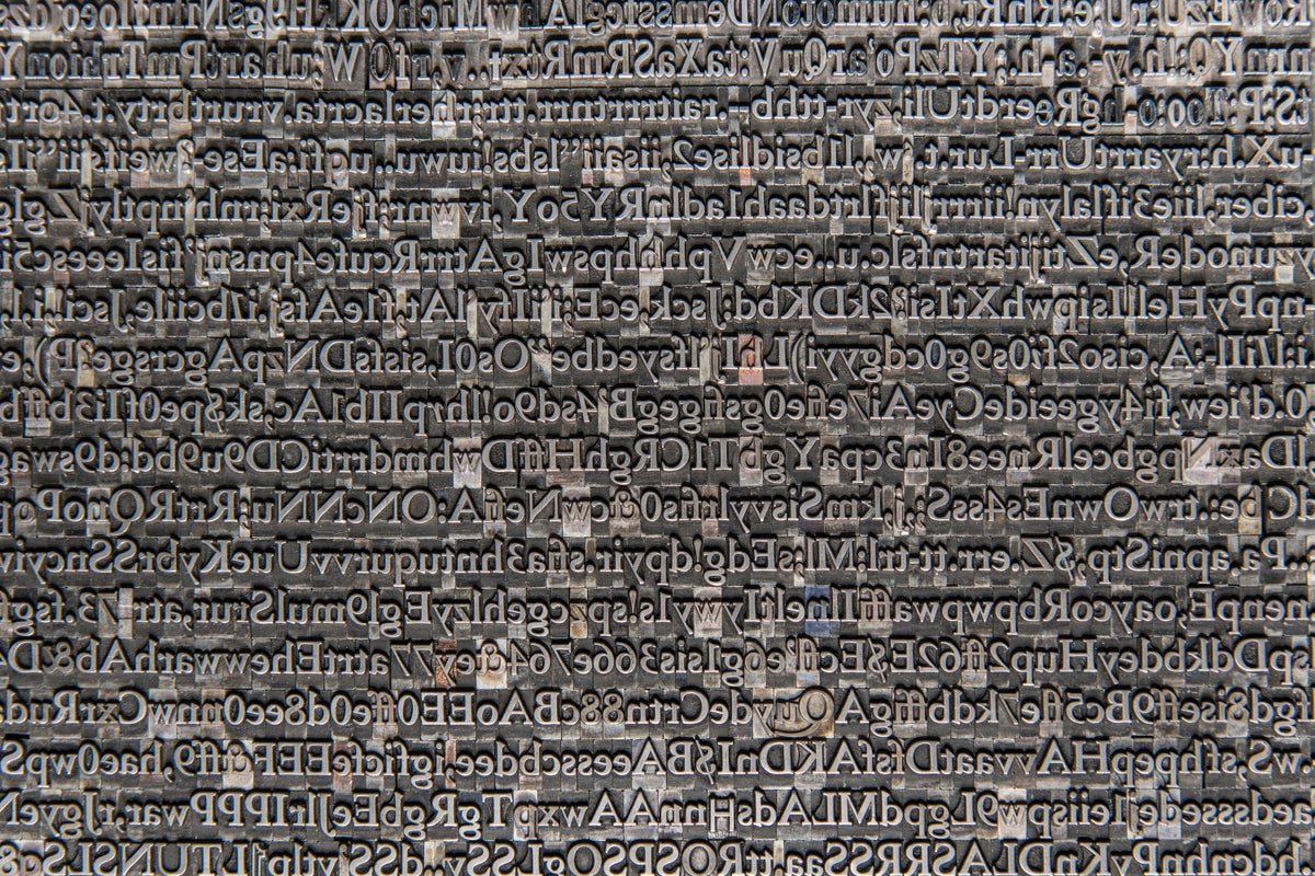 Old metal printing letters used for traditional letterpress text printing.