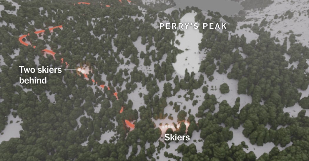 The positions of the skiers and the extent of the avalanche path are approximate based on survivor accounts, an avalanche report from the Sierra Avalanche Center and avalanche experts. New York Times journalists built the 3-D model of the area using a 2021-2022 laser scan from the United States Geological Survey.