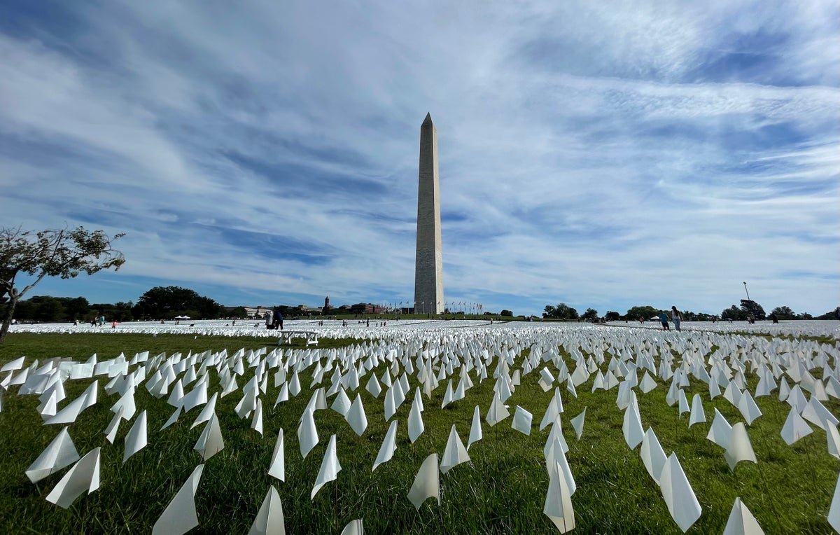 White flags are displayed in front of the Washington Monument in a 2021 commemoration of those killed by COVID.