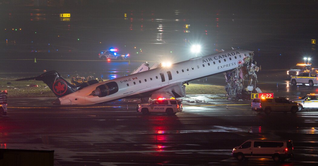 A New York Times journalist at the airport early Monday saw police vehicles and fire trucks next to a white Air Canada Express plane with a sheared-off nose on the runway. A damaged truck lay on its side nearby.